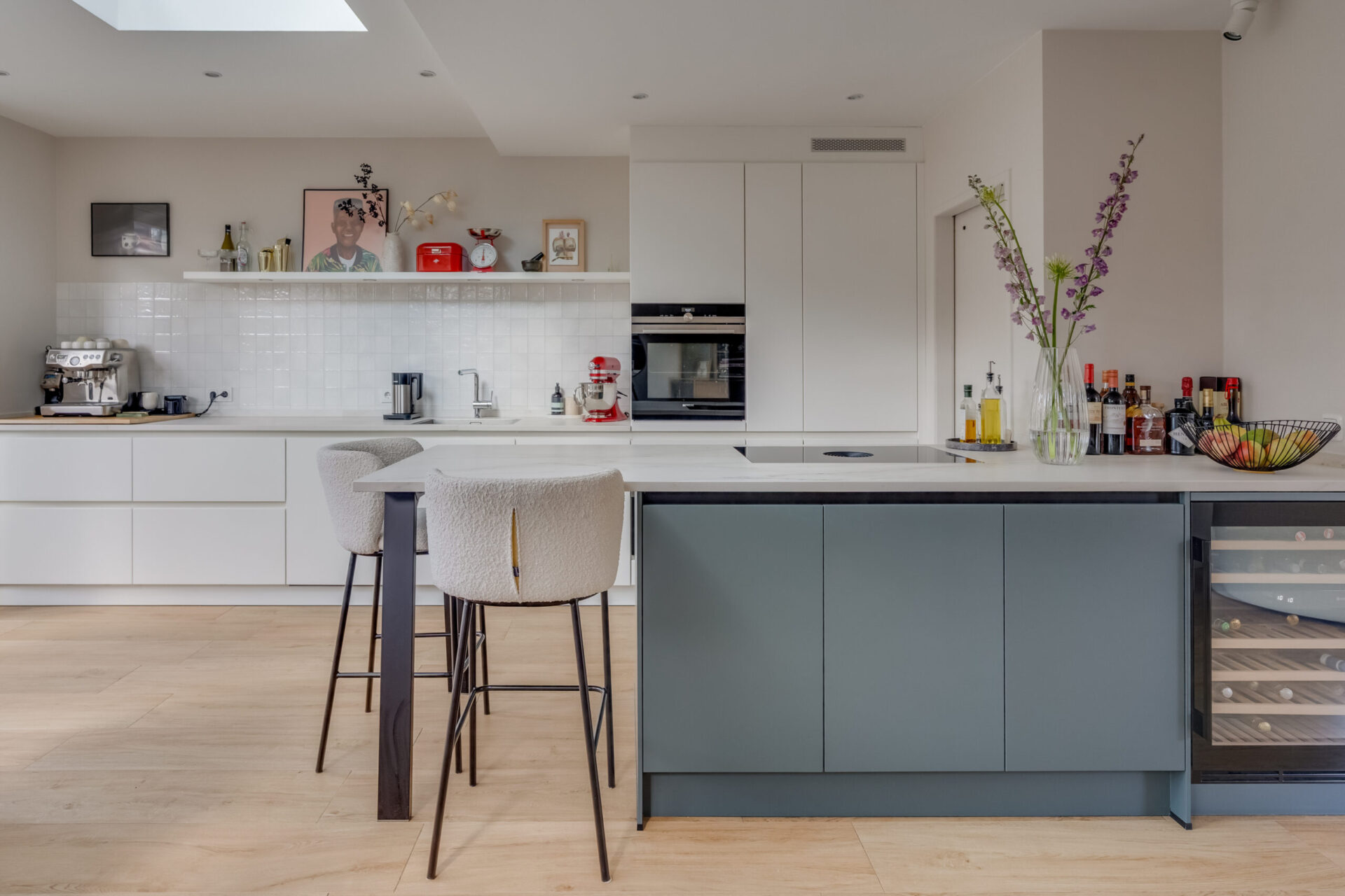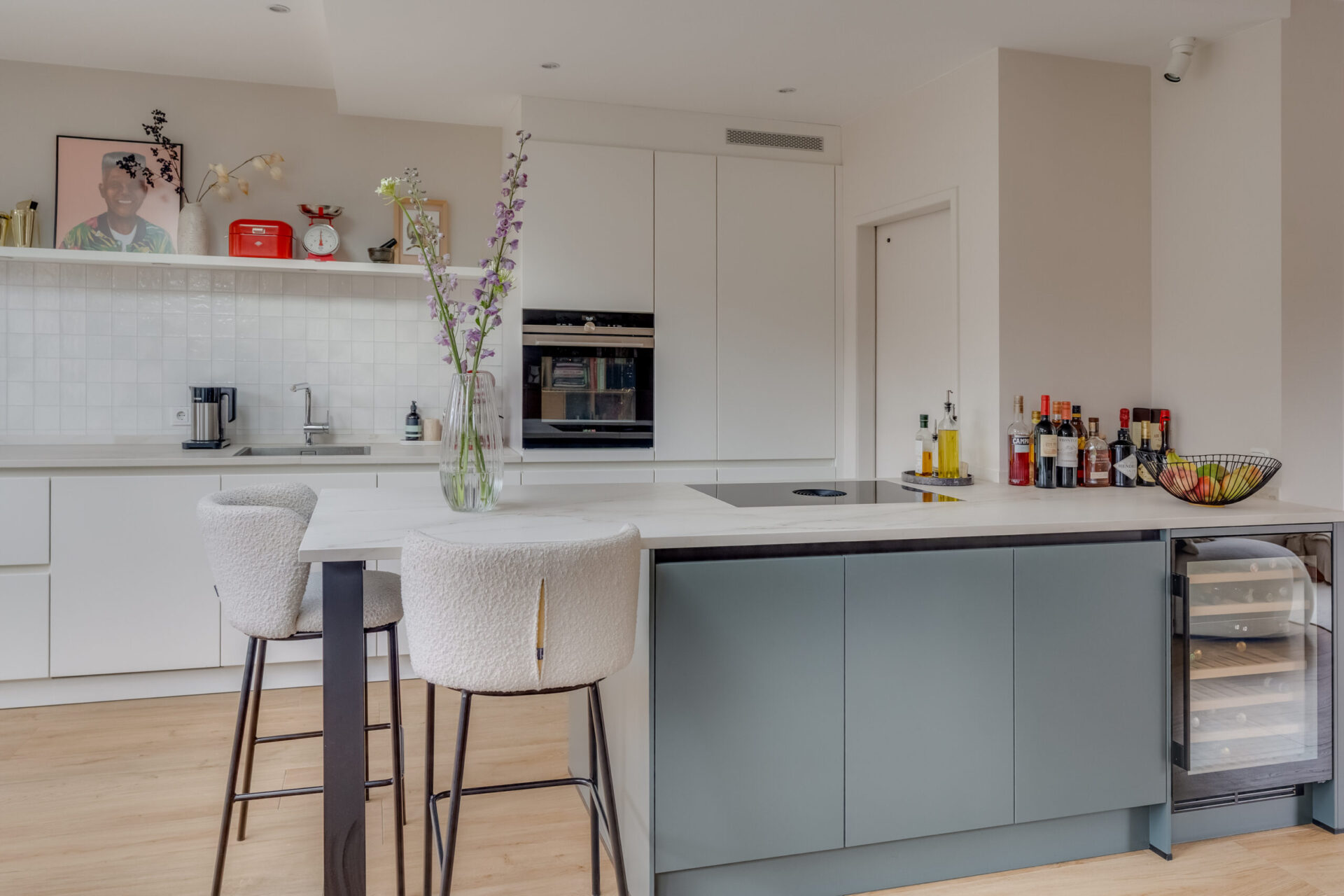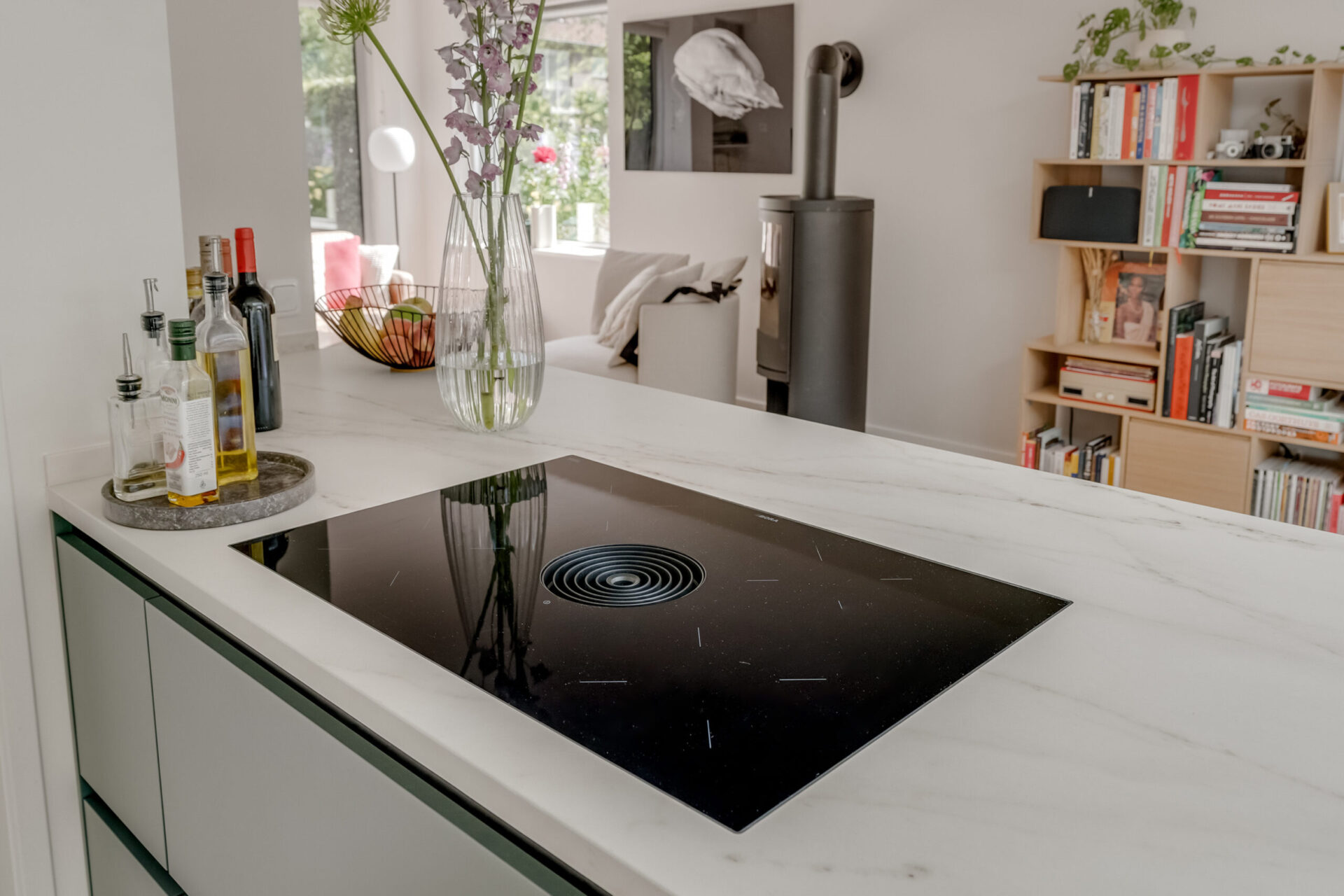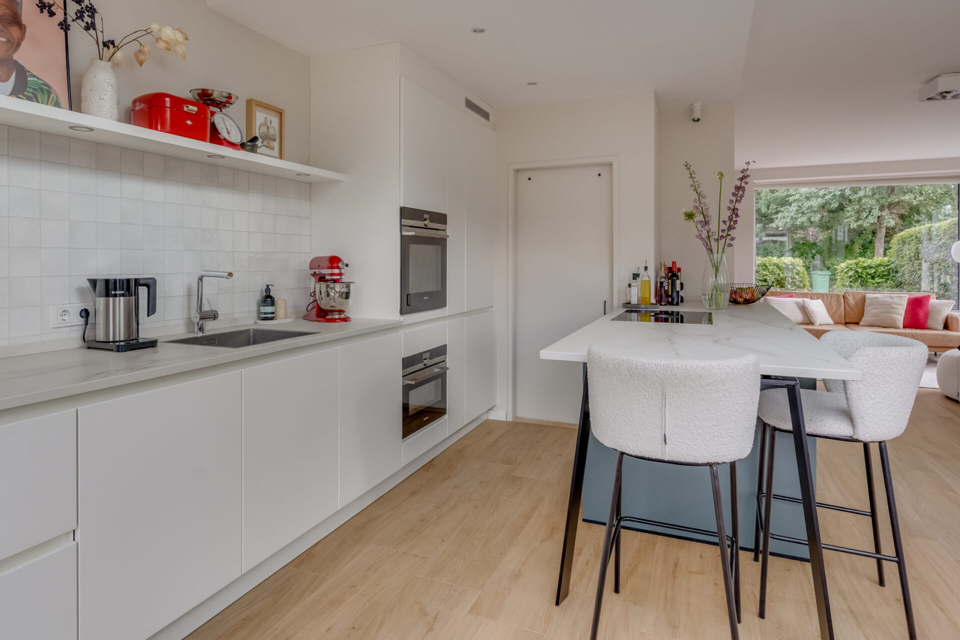 De moderne keuken is een echte eyecatcher met kookeiland, inductiekookplaat met geïntegreerde afzuiging, combi-oven, vaatwasser, koel/vriescombinatie en wijnklimaatkast.