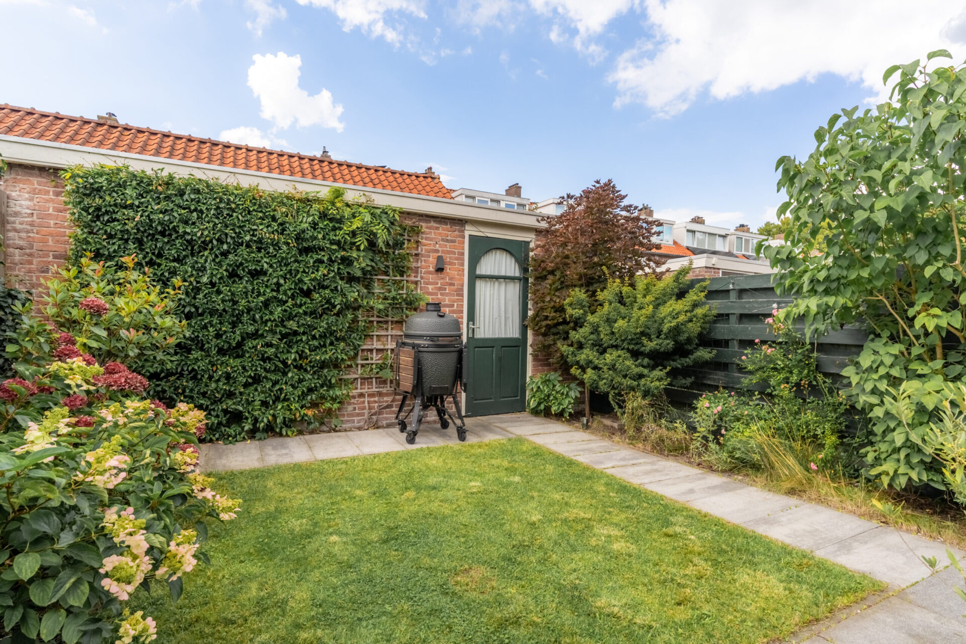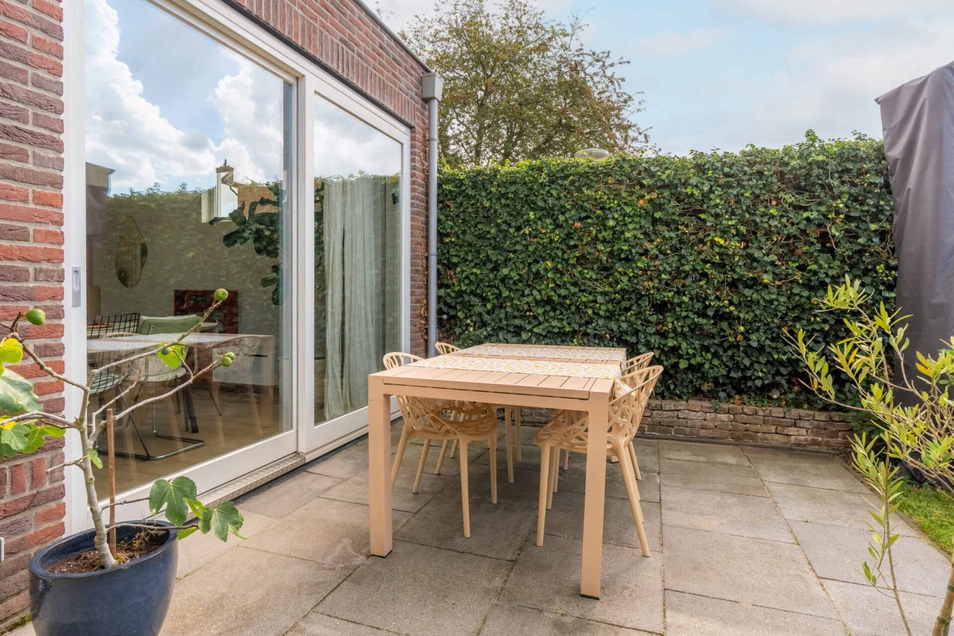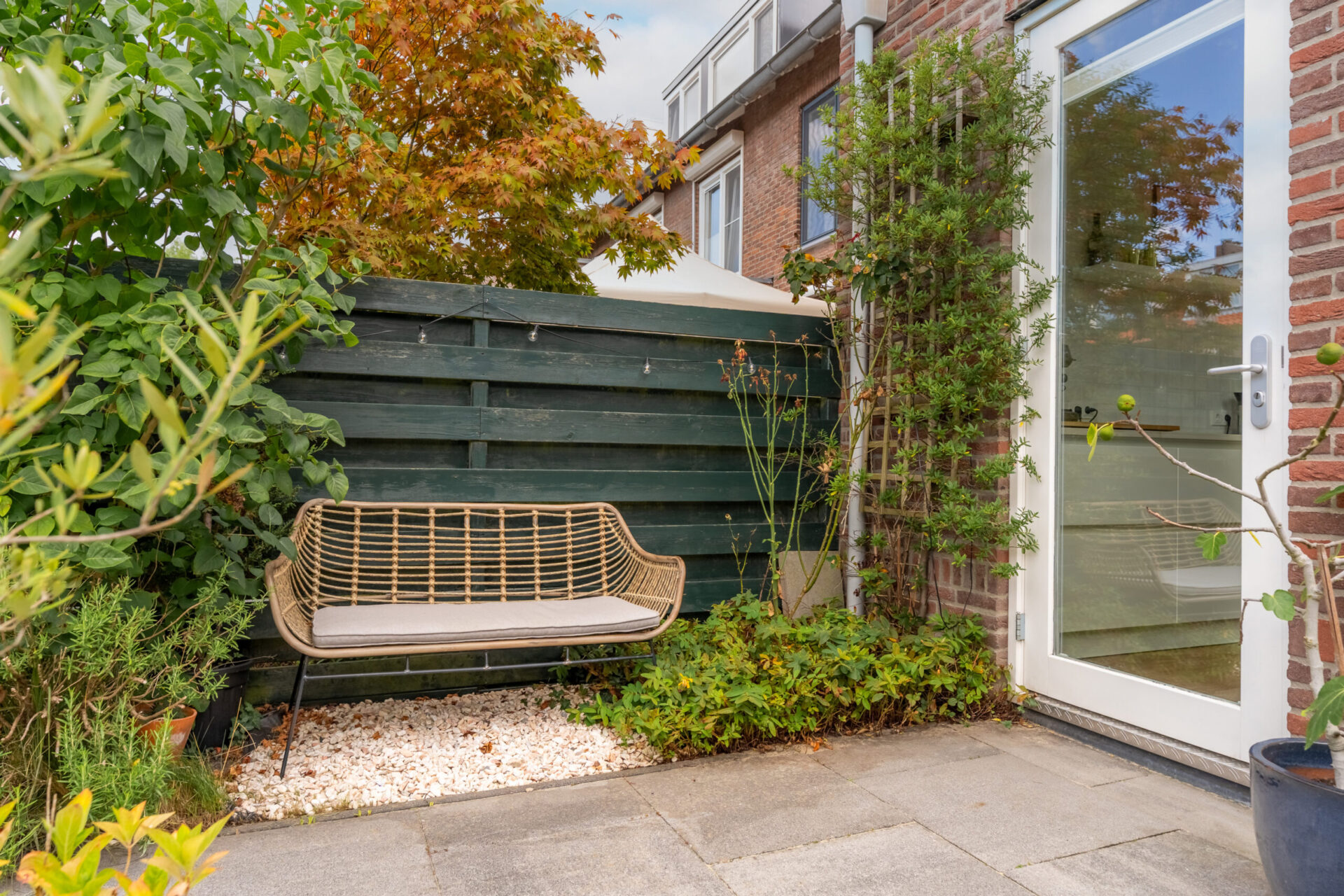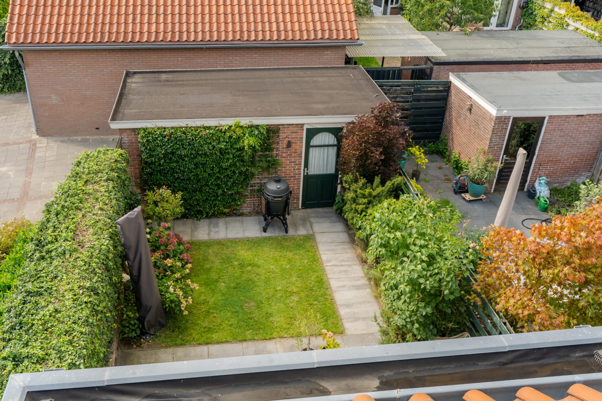 De zonnige achtertuin (ca. 7,5 meter diep) ligt op het westen en grenst direct aan de garage. Deze is voorzien van elektra en een elektrische deuropener.