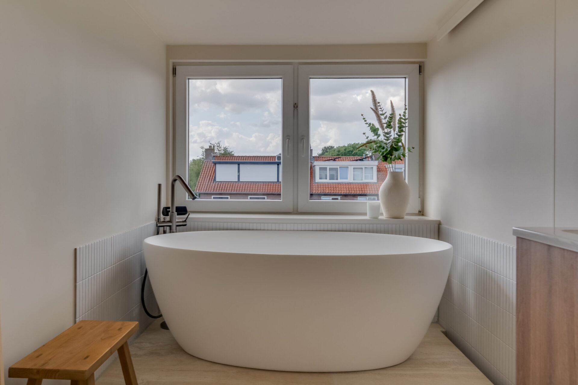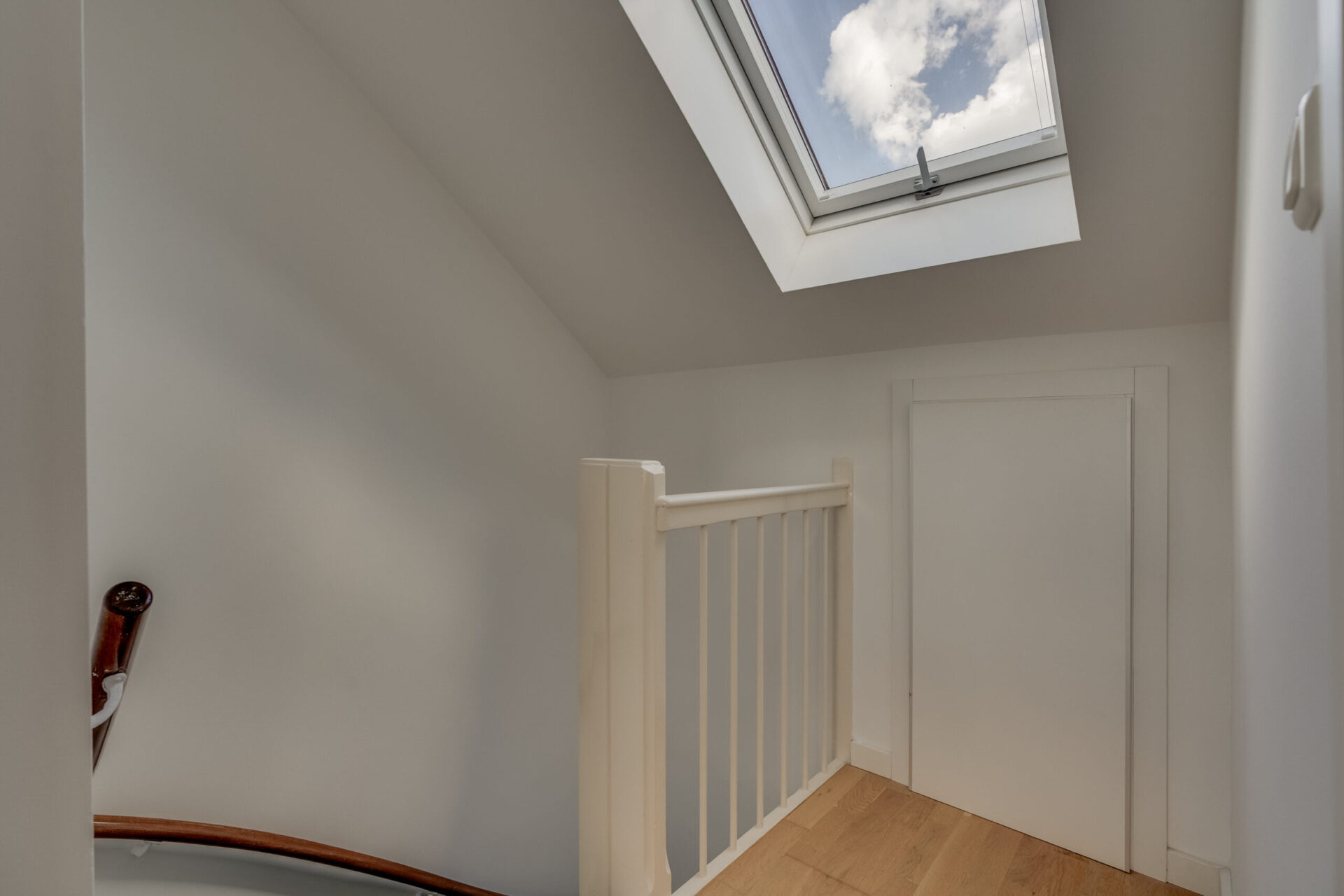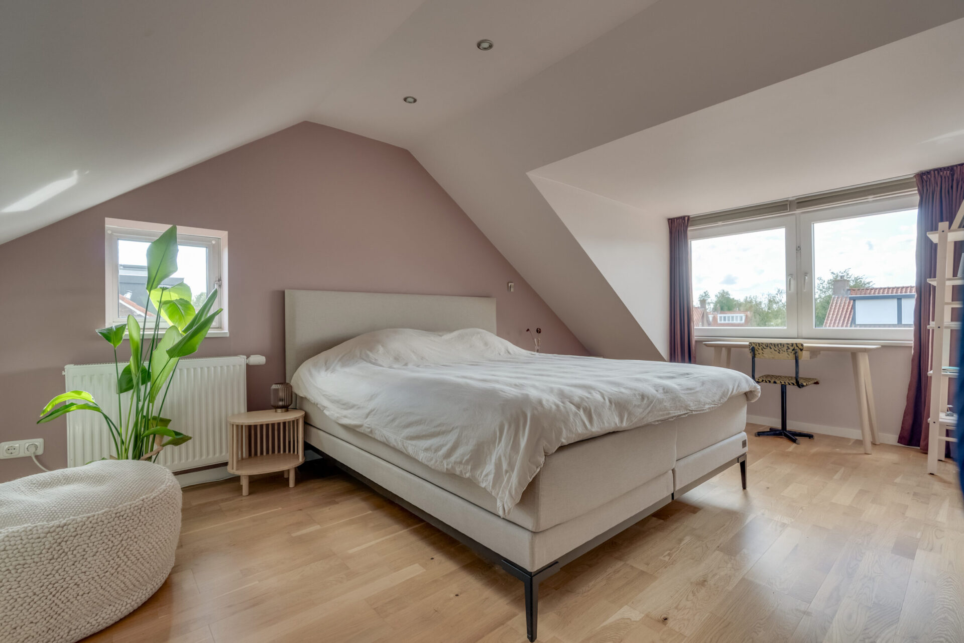 Hier bevindt zich een royale vierde slaapkamer met dakkapel, extra zijraam en bergruimte achter het knieschot. Daarnaast is er een luxe tweede badkamer met vrijstaand bad en wastafel. De voorzolder biedt plek aan de wasmachine/droger en heeft een extra dakraam.