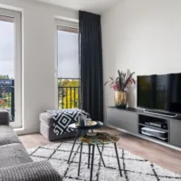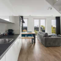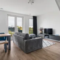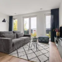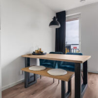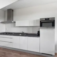 De ruime woonkamer is voorzien van een moderne vloer en geeft via openslaande deuren toegang tot het zonnige balkon op het zuidwesten. De woonkamer staat in open verbinding met de keuken, die is uitgerust met diverse inbouwapparaten. In de keuken vind je bovendien een praktische bergkast, waarin de cv-ketel en de warmte-terugwininstallatie zijn opgesteld.