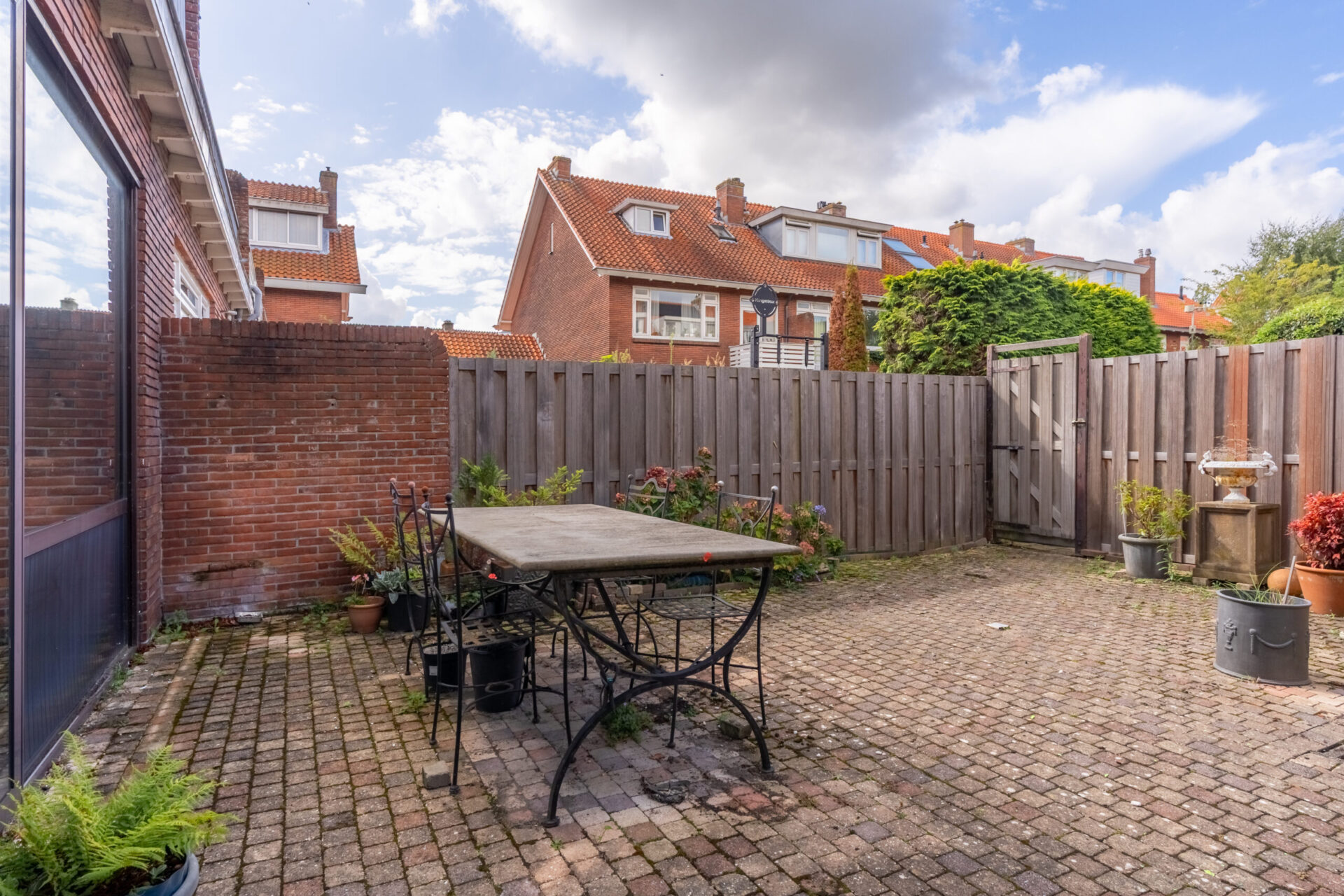 De achtertuin is bijna 8 meter diep, ligt op het noordwesten en beschikt over een stenen berging. Er is ook een achterom.