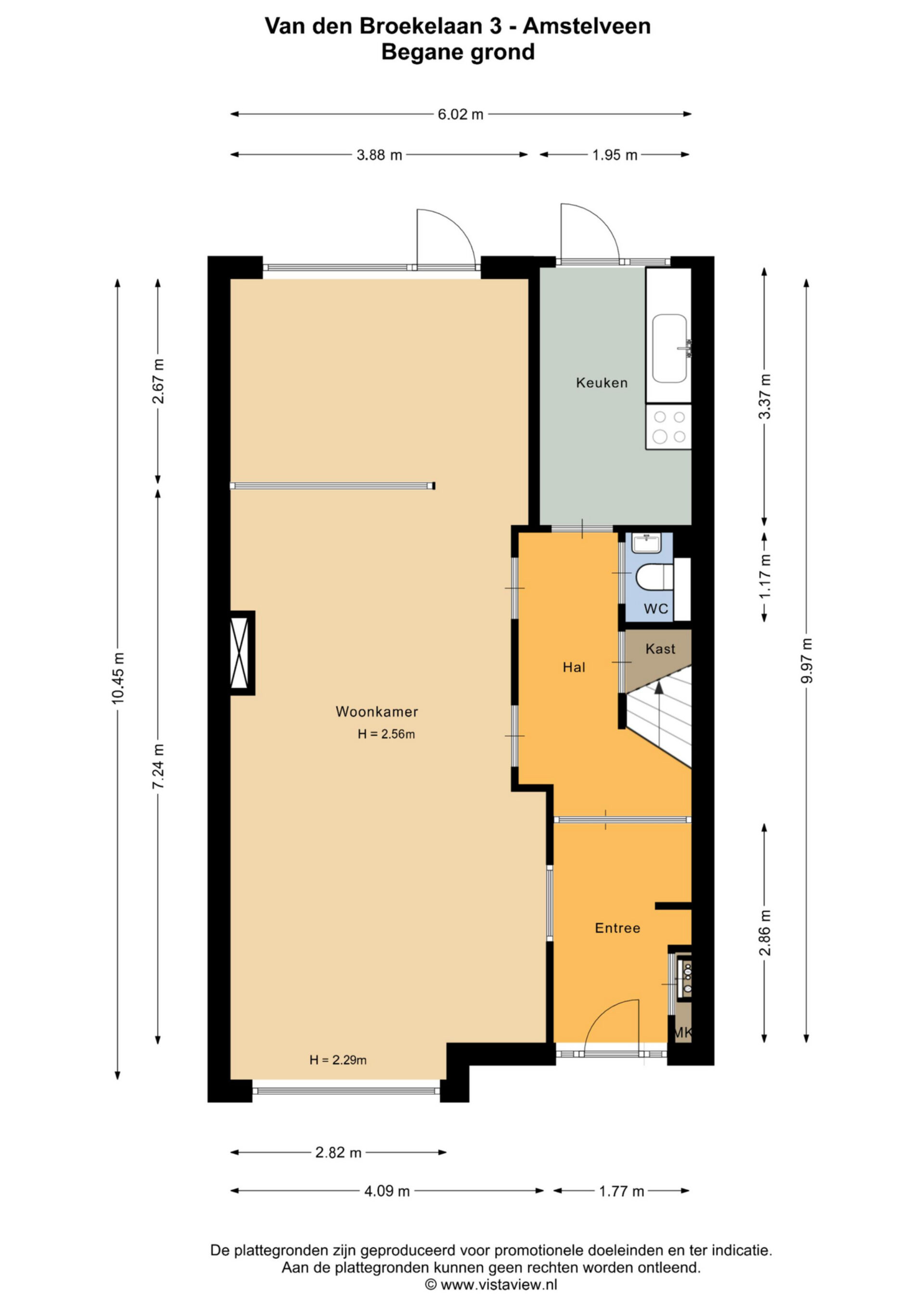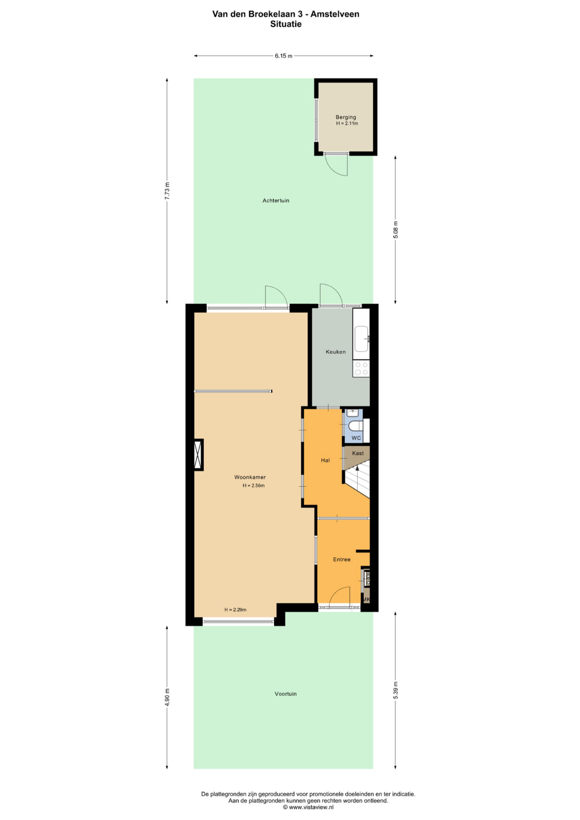 Entree, hal met toilet, royale en lichte woonkamer met schuifpui en een dichte keuken aan de achterzijde met toegang tot de tuin.