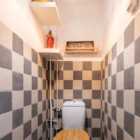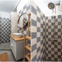 De badkamer is verzorgd en voorzien van een douche en een wastafelmeubel. Het toilet bevindt zich separaat, wat zorgt voor extra comfort.