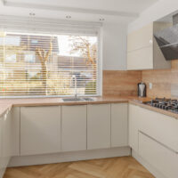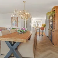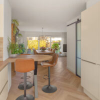 Via de entree kom je in de ruime hal met toegang tot het toilet, de inpandige garage en de woonkamer. De gezellige en lichte woonkamer is gericht op de achtertuin en vormt het hart van het gezin. Dankzij de vloerverwarming en de visgraatvloer is het hier het hele jaar door comfortabel. Aan de voorzijde van de woning bevindt zich de moderne keuken, voorzien van diverse inbouwapparatuur en volop werk- en bergruimte.