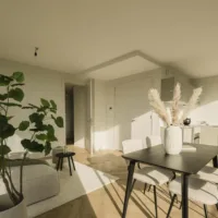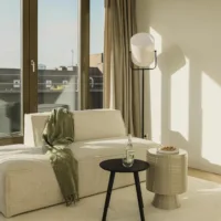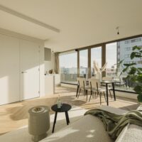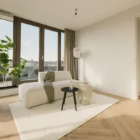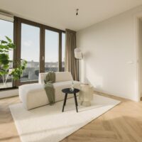 Zodra je binnenkomt valt een ding meteen op: het licht. Door de enorme glaspuien die over bijna de volledige gevelbreedte doorlopen, stroomt de zon de woonkamer binnen. De open indeling, het neutrale kleurenpalet en de visgraatvloer geven de ruimte een rustige en moderne uitstraling.