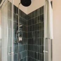 De badkamer is fris, modern en voorzien van een ruime inloopdouche met donkere wandtegels, een strak wastafelmeubel en heeft een rustige, warme kleurstelling.