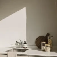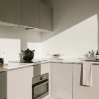 De moderne keuken is strak, licht en luxe uitgevoerd, met: inductiekookplaat, moderne afzuiging, combi-oven, strakke kastenwand, ruim werkblad en een tijdloze afwerking.