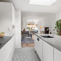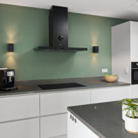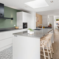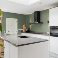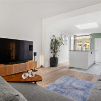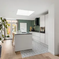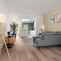 De woonkamer voelt direct prettig aan door de natuurlijke lichtinval, de houten vloer en de rustige afwerking. Er is een gezellige eethoek en onder de trap voldoende bergruimte door een ruime trapkast. Aan de achterzijde bevindt zich de open keuken, het hart van het huis. Boven het kookeiland is een lichtstraat geplaatst die zorgt voor extra daglicht en een open, ruimtelijk gevoel. De keuken is praktisch ingedeeld, voorzien van alle moderne inbouwapparatuur en biedt voldoende werk- en bergruimte. Via de openslaande deuren stap je zo de tuin in. In het verlengde van de keuken bevindt zich de praktisch ingerichte wasruimte met alle witgoed aansluitingen en toegang tot het toilet.