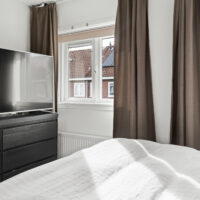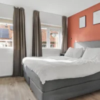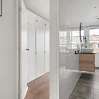 Op de eerste verdieping vind je een ruime slaapkamer met een kleedkamer die ook kan fungeren als slaapkamer. Beide kamers beschikken over een ingebouwde kledingkast. De badkamer is stijlvol ingericht met een inloopdouche, dubbele wastafel en rustige kleuren.