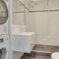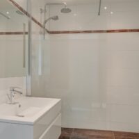 Badkamer: moderne badkamer in wit/terracotta kleurstelling met prachtige vloer- en wandtegels. De badkamer is voorzien van een inloopdouche, een wastafelmeubel, een tweede toilet en aansluitingen voor wasmachine en droger.