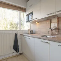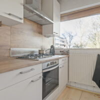 De lichte keuken beschikt over voldoende werk en bergruimte en biedt toegang tot de badkamer en wasruimte. De badkamer is functioneel en netjes bemeten. In de hal bevindt zich daarnaast een separaat toilet, wel zo prettig.